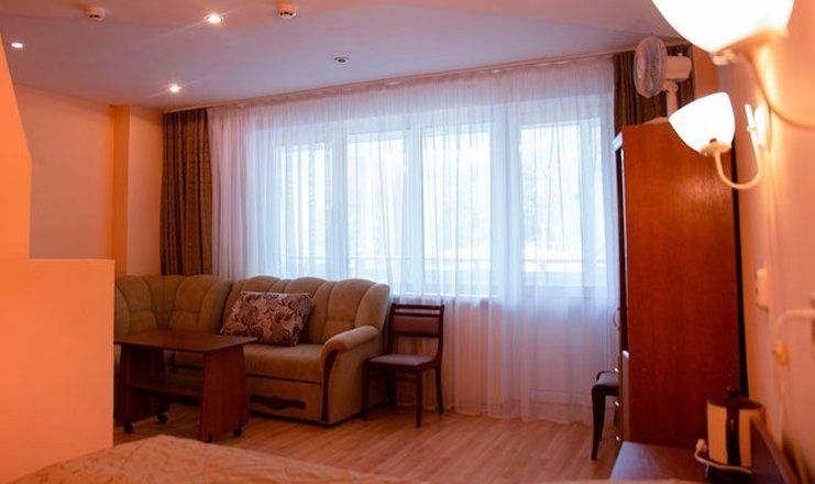В номере: кровать двуспальная, прикроватные тумбочки, шкаф, мягкая мебель, телевизор, холодильник, чайный набор посуды