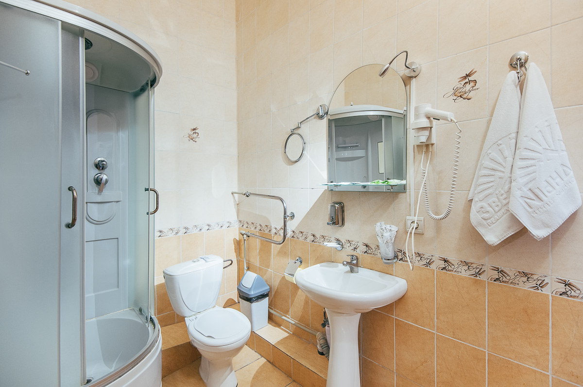 Сан-узел: ванная комната, с набором полотенец, индивидуальные наборы косметики, унитаз, фен.