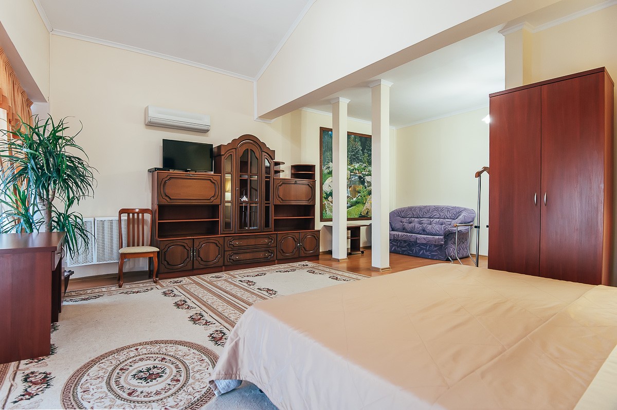 В номере: большая двуспальная кровать или две полутороспальных, кондиционер, электронный замок, телефон, телевизор с кабельными каналами, холодильник, письменный стол и стул, багажная тумба, сейф.