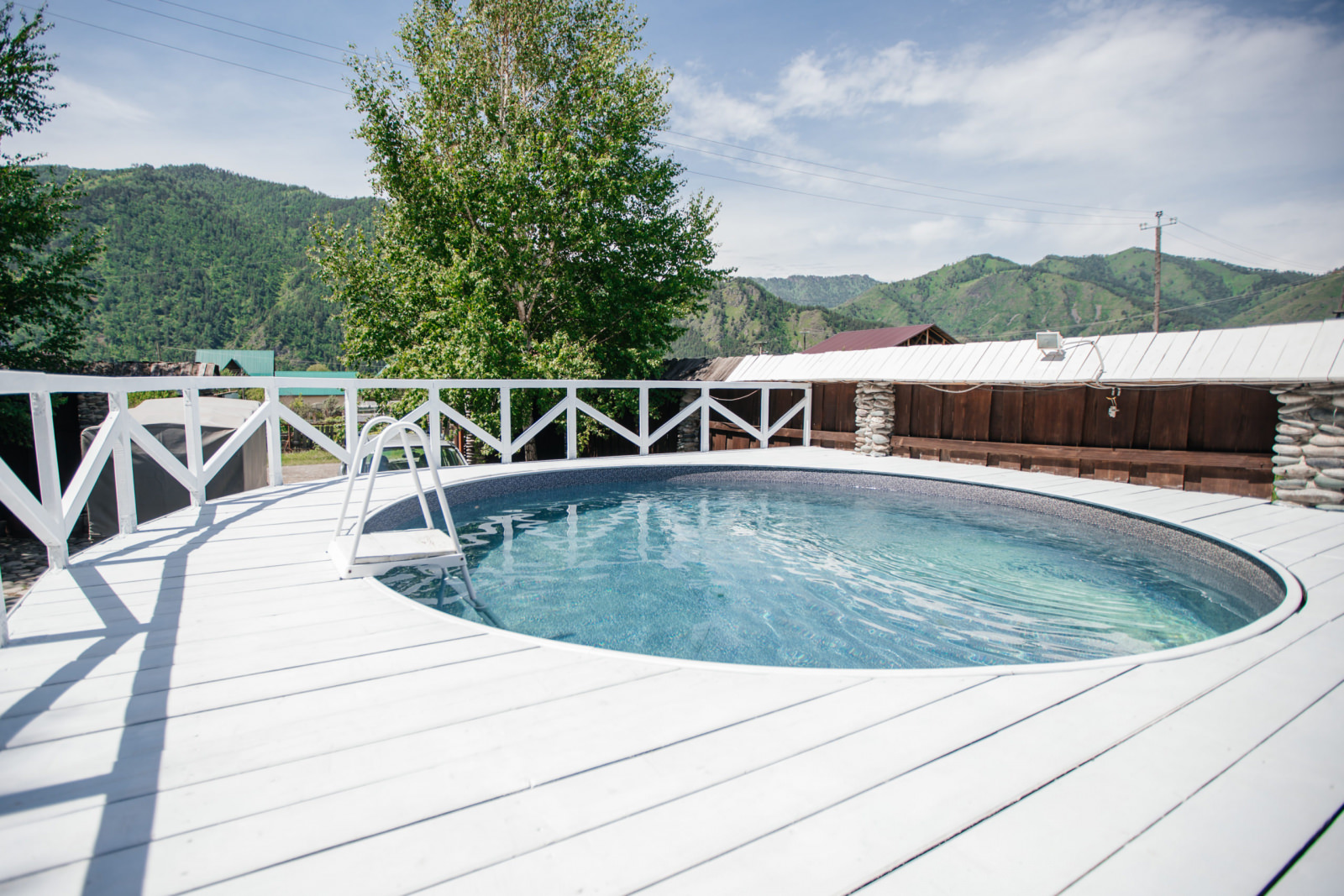 • с шезлонгами и зонтиками, вода  пресная, подогреваемый, пользование бассейном входит в стоимость, работает сезонно
